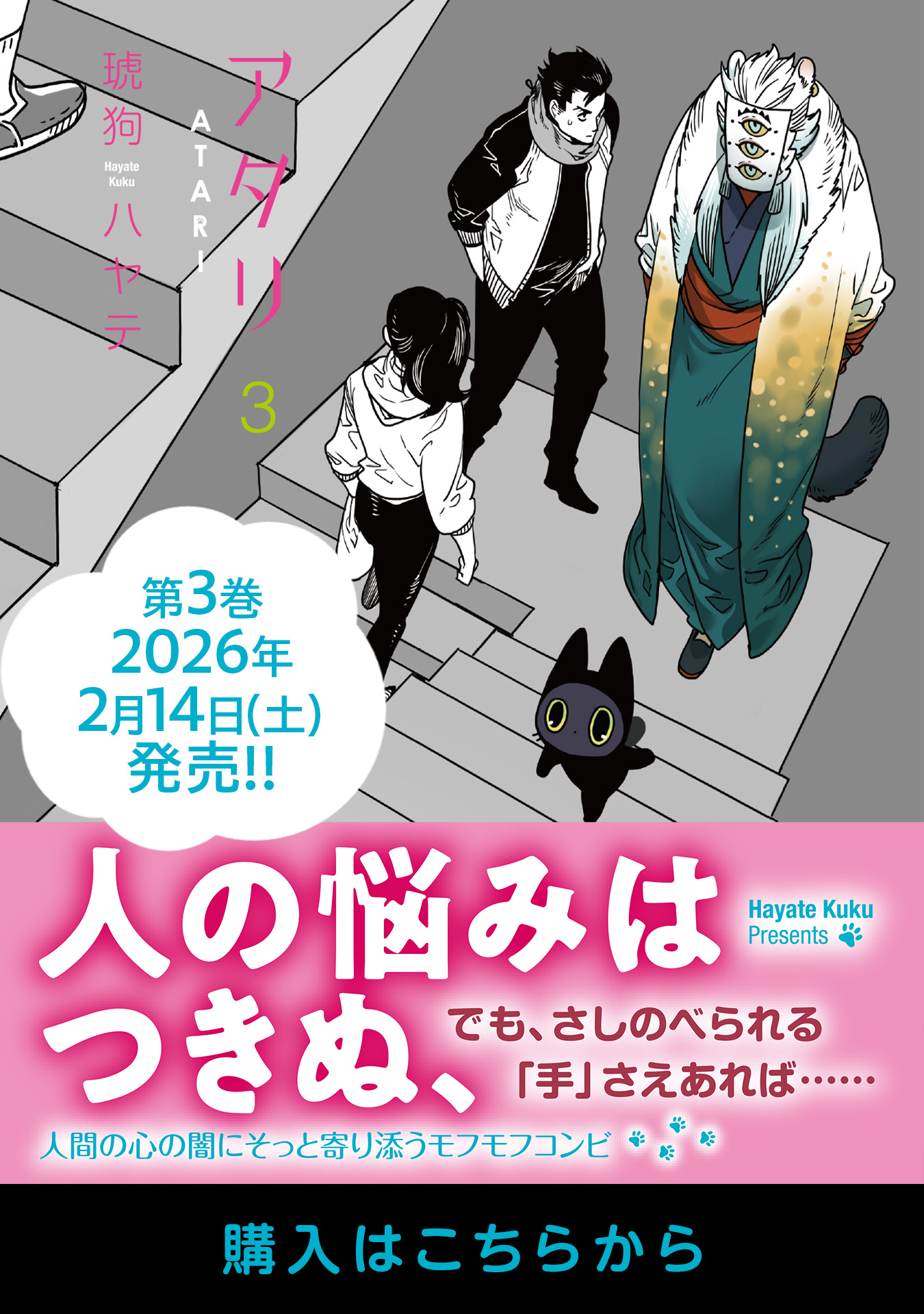 「アタリ」(1~2巻)に登場する小さな守り神“クロ”が大活躍する「ねこまた。」全6巻発売中!! 主従の絆を描く「ヤヌス」1~3巻も発売中!!